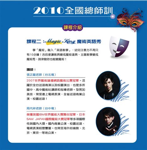 8/1、15兩天吉的堡將舉辦全國總師訓,RIC魔術師周代祥、張正龍將把魔術運用到美語教學中,讓來自各地的美語教師學會在課堂上精采有趣的魔術表演!
