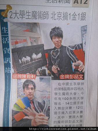 在中國北京舉辦的第5屆兩岸四地大學生魔術大會,今年有100多所大學報名,14位選手進入舞台決賽,12位選手進入近景決賽。其中,實踐大學的魔術師彭品文與東海大學魔術師陳育軒,分別為台灣摘下金獎和銀獎。