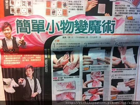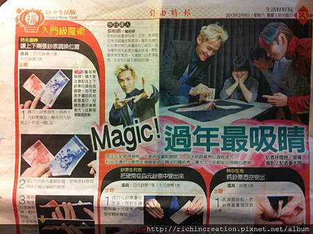 於2月9日的自由時報除夕生活版E32、E33兩面,柏辰免費大放送!教所有的讀者使用生活中簡單的小物品變魔術,讓大家過年不無聊!