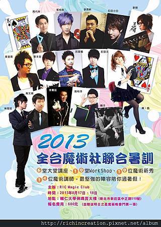由RIC魔術俱樂部所舉辦的2013全台魔術社聯合暑訓邀請多位優秀魔術師擔任講師,講師們無不展現自己的拿手絕活,並且分享給在場的學生們,秉持著"傳承"的精神,讓大家可以學習到正確的魔術觀念及技巧,台灣雖然沒有非常完善的學習環境,但我們有無私的講師們以及熱情的學生,期待各位青年魔術師們能在未來的舞台上發光發熱!