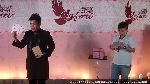 魔術師 陳韋榮為氛堤打造出獨一無二的客製化演出,利用氛堤商標上的禮物盒、鴿子、碎紙花等元素巧妙的融合在魔術表演中,使現場觀眾驚喜連連,成功的將氛堤公司幸福洋溢的理念營造出來。